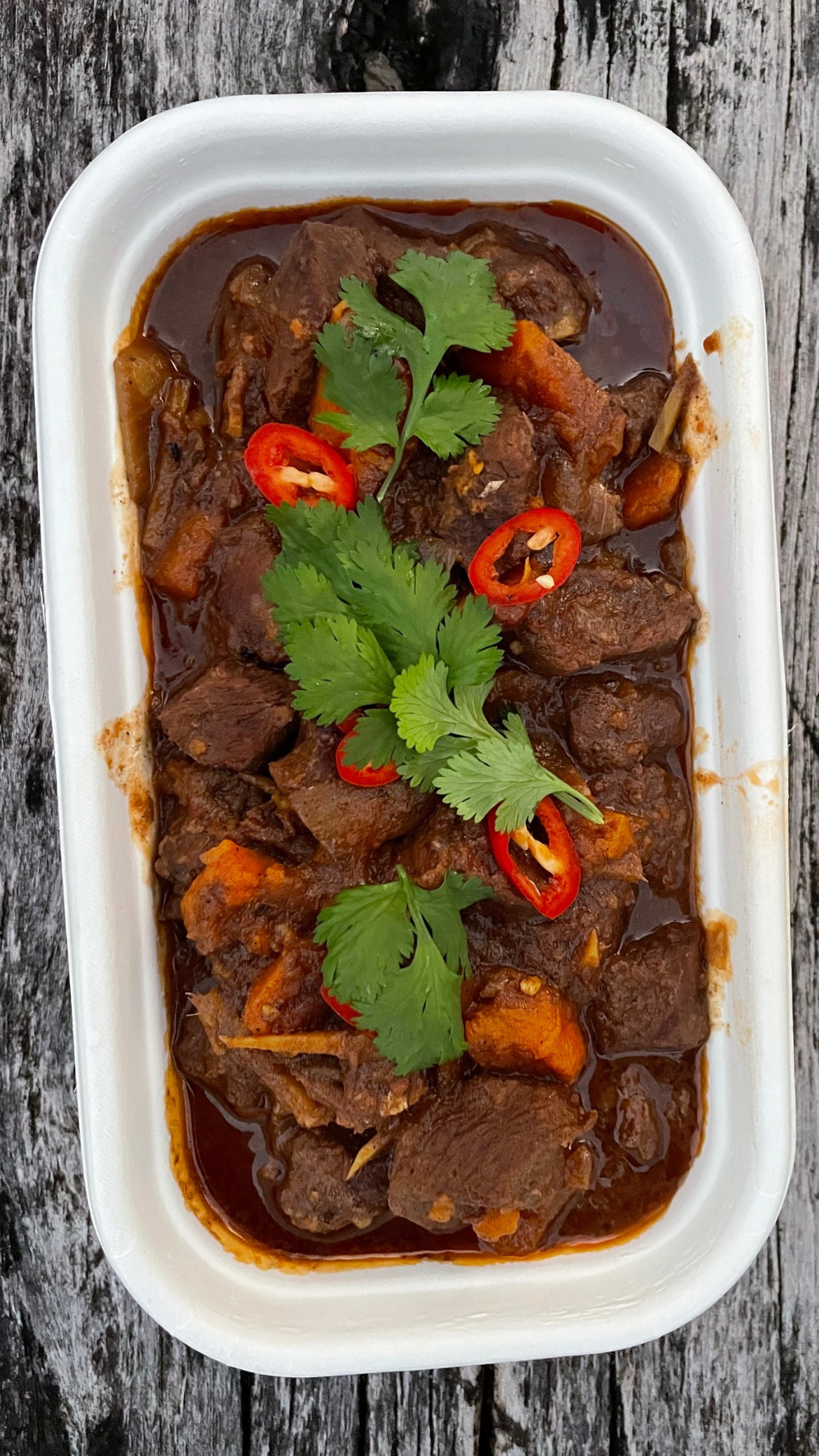 Beef, water, sweet potato, onion, celery, tomato, beef bone broth, ginger, garlic, coconut aminos (coconut blossom nectar), balsamic vinegar, apple cider vinegar, five spice (cinnamon, szechuan pepper, fennel seed, star anise, cloves), olive oil, coriander, red chilli, salt, pepper.